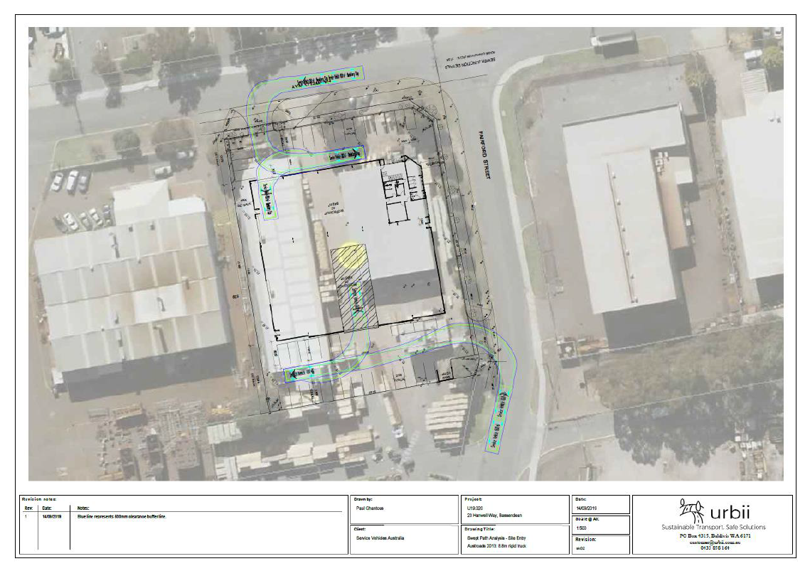 Urbii prepared a Transport Impact Statement report for this proposed development in Bassendean. Urbii has been engaged to review the development plan. Urbii undertook swept path analysis for various design and checked vehicles. Urbii also prepared a brief technical note detailing the outcomes of the review.